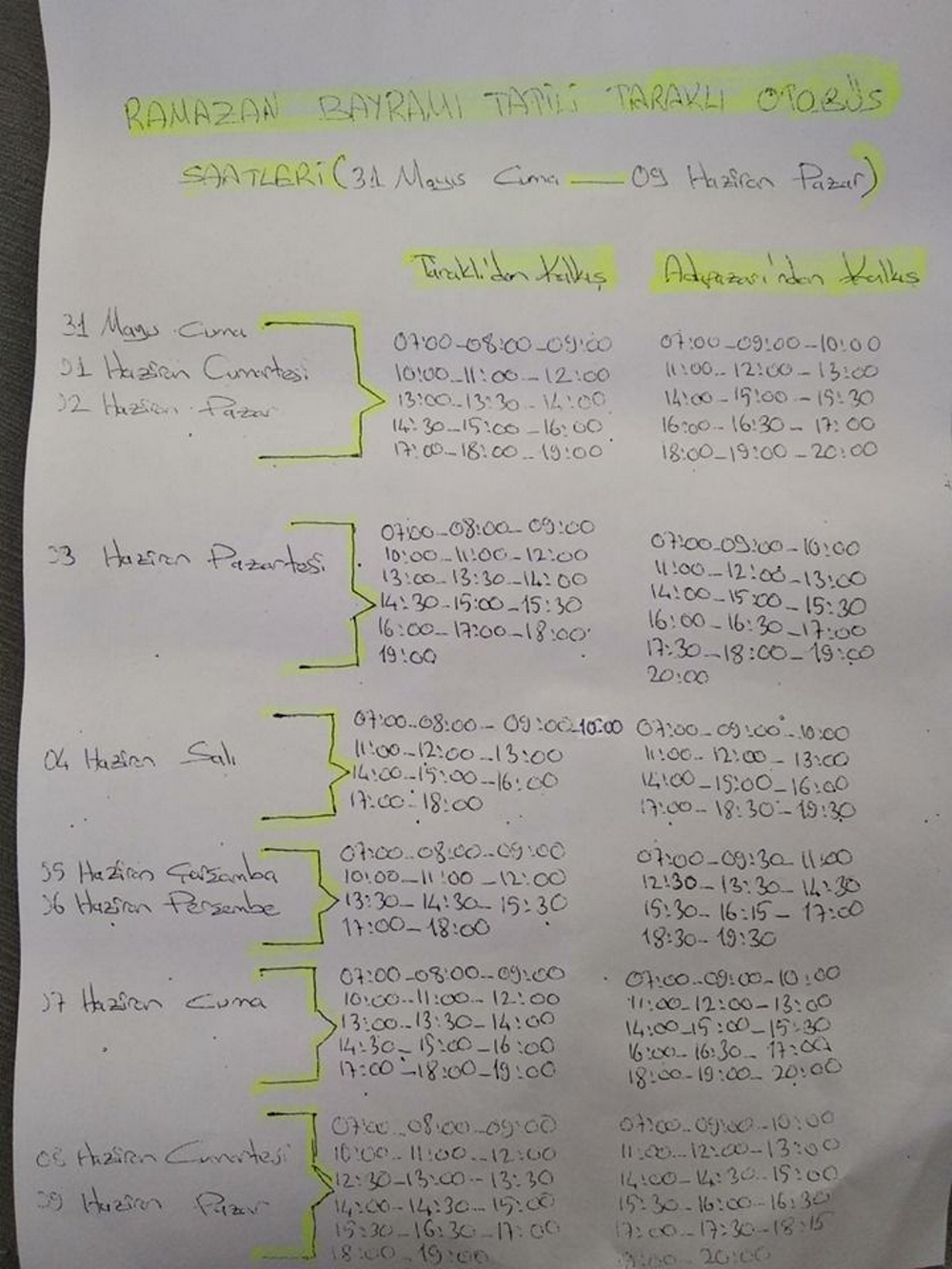 Hafta i̇çi̇ son sefer saatleri̇.